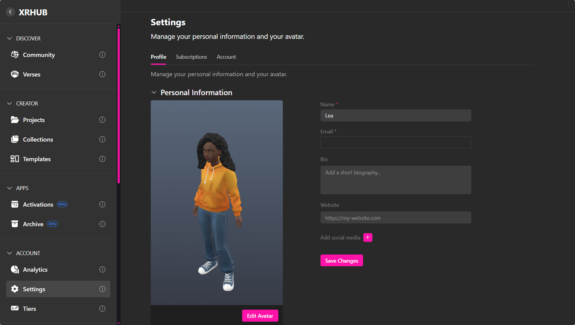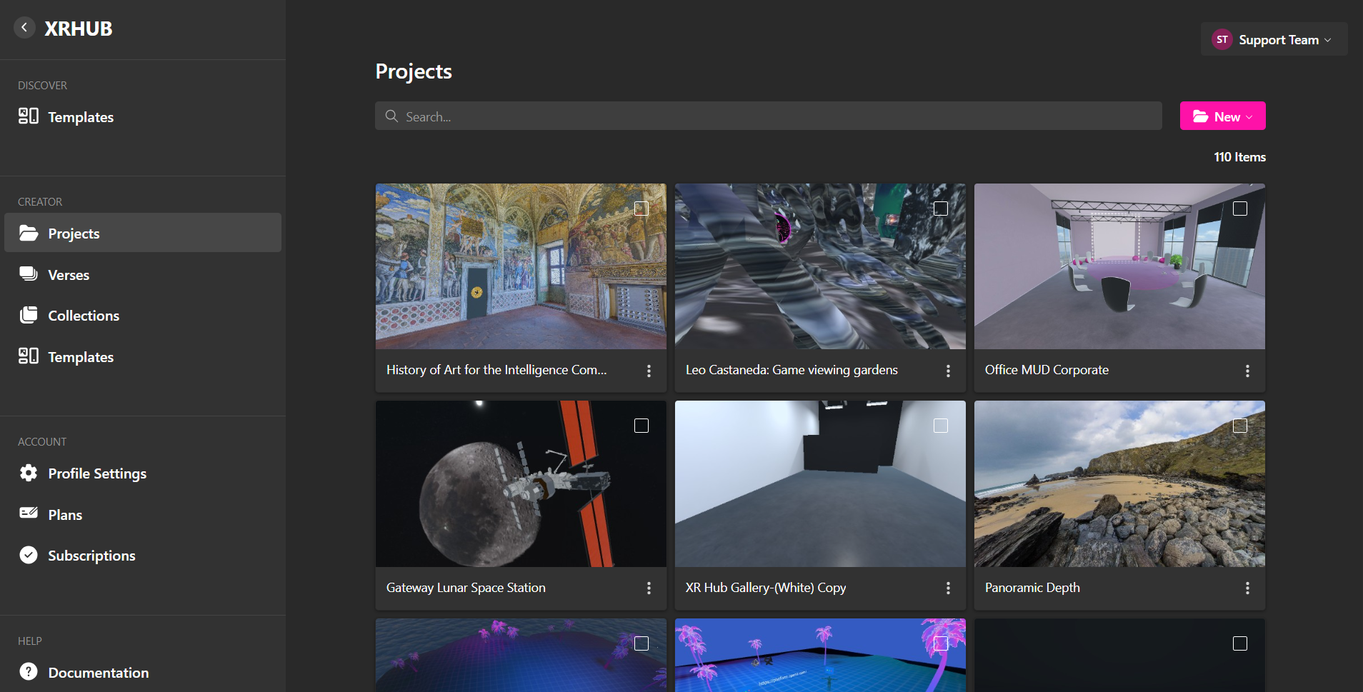 XRHUB funciona como la interfaz centralizada para gestionar todo el contenido, recursos y aplicaciones XR. Es el punto de entrada para iniciar nuevos proyectos, organizar los existentes y publicarlos como Verses en vivo.
